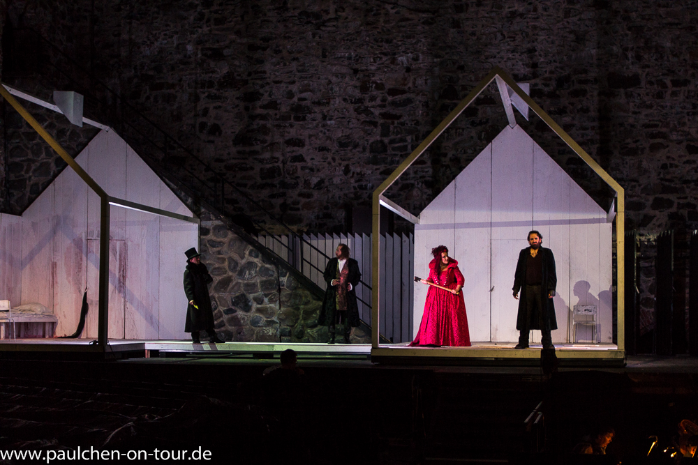 Unser nächstes Ziel Savonlinna ist bekannt für seine schöne Burg Olavinlinna und die jährlich stattfindenden Opernfestspiele. Wir fanden einen zentralen Nachtplatz unweit der Burg mit Free WIFI und konnten nachts das WM Achtelfinale gegen Frankreich verfolgen. Am nächsten Morgen verdunkelte sich der Himmel verdächtig, dass wir schnell unsere Kameras schnappten und zur Burg marschierten, um wenigstens im Trockenen ein paar Außenaufnahmen zu machen. Bis zur Öffnung der Burg um 10 Uhr hatten wir noch 45 Minuten Zeit. Als wir so zur Burg schlenderten überholten uns zwei finnische Paare, die schnurstracks zum Eingang liefen, der überraschenderweise offen war, obwohl das Tickethäuschen noch nicht besetzt war. Das machte uns neugierig und wir folgten den Finnen und kamen in den für die Festspiele überdachten und bestuhlten Innenhof, wo reges Treiben herrschte und im Orchestergraben fleißig die Instrumente gestimmt wurden. Wir setzten uns in eine der Reihen und warteten ab, was weiter passieren würde. Es kamen Film- und Fotoreporter, Personen in Kostümen liefen herum und der Orchestergraben füllte sich. Um 10 Uhr gab es Regieanweisungen und die Generalprobe begann. Es handelte sich um ein zeitgenössisches Stück „ KULLERVO“ von Aulis Sallinen (* 1935, einem der bedeutendsten Komponisten Finnlands unserer Zeit. Oper in zwei Akten (1986-88), basiert auf einer Episode des finnischen Nationalepos Kalevala).Wir verfolgten die Aufführung und schlichen vor der Pause hinaus. Am Eingang zur Arena wurden nun die Tickets der Besucher kontrolliert. Wir besichtigten noch die Burg und machten uns dann auf nach Kerimäki, wo die größte Holzkirche der Welt steht.