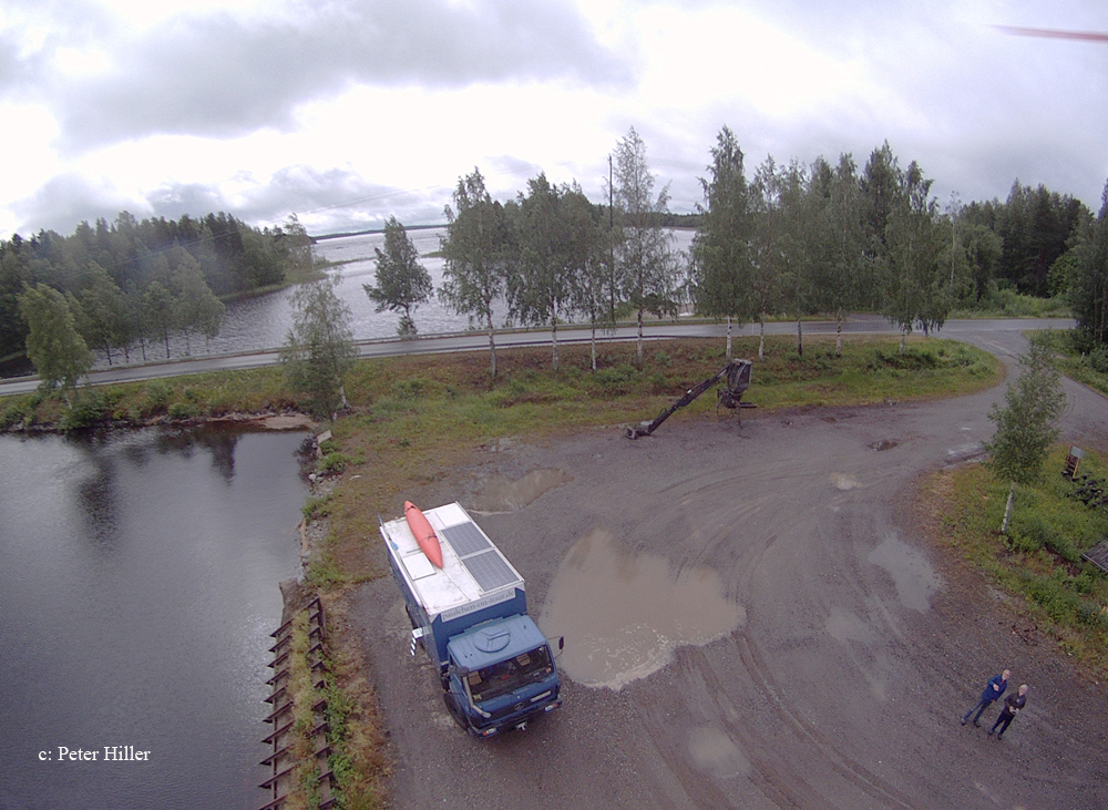 Weiter fuhren wir auf einer Nebenstrecke quer durch das Seengebiet. Auch hier verbinden teilweise Fähren die Straße zwischen den Inseln, die ebenfalls kostenlos sind. An unserem Übernachtungsplatz am See vor Joensuu trafen wir Peter und Maritta. Peter ließ seinen Quadrocopter mit Actioncam über den Platz fliegen und fotografieren. Nun hat Achim eine Position mehr auf der Wunschliste der Dinge, die man unbedingt haben muss.
