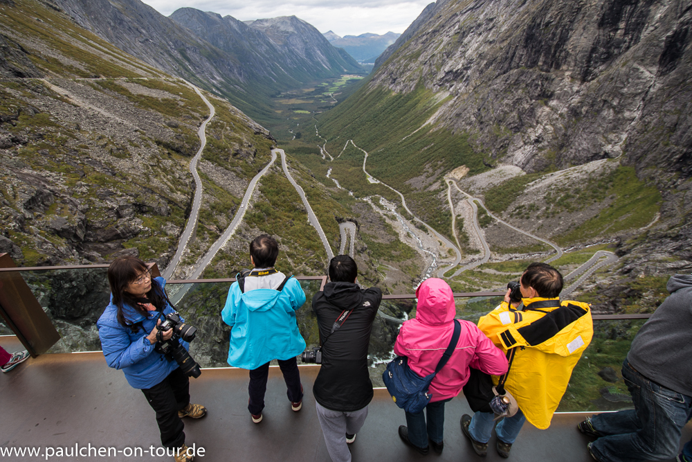 Die weitere Strecke führte uns zu den touristischen Highlights von Fjord-Norwegen und entsprechend viele, meist asiatische Touristen trafen wir dort an. Zunächst schraubten wir uns auf den engen Serpentinen des Trollstigen 800 Höhenmeter hinauf zur Aussichts-plattform mit spektakulären Ausblicken auf die Passstraße.