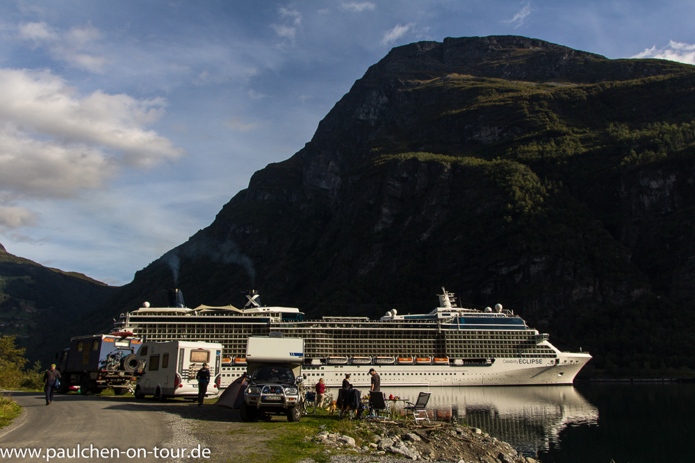 Am nächsten Morgen standen wir dann in der ersten Reihe, um dem Einlaufen des größten Kreuzfahrtschiffes (3800 Passagiere) der Saison beizuwohnen. In dieser Saison legten von Mai bis September 211 Kreuzfahrtschiffe im Geirangerfjord an, bis zu 4 gleichzeitig, nicht mitgezählt das tägliche Schiff der Hurtigrute.