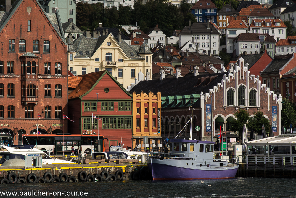 Neben dem historischen Viertel Bryggen mit den bunten Holzhäusern ist auch ein Stopp am Torget mit dem bei Touristen beliebten Fischmarkt lohnend. Hier gibt es Stände mit frischem Fisch und anderen Meerestieren, meist angeschlossen ein Restaurant oder Imbiss. Da dies primär ein Saisongeschäft ist, rekrutiert sich das Personal überwiegend aus internationalen Studenten und Saisonarbeitern. Diese Praxis konnten wir an mehreren Orten in Norwegen im Tourismusbereich feststellen. Nachdem wir stundenlang durch die lebhafte Stadt gebummelt waren verließen wir sie am Nachmittag wieder.