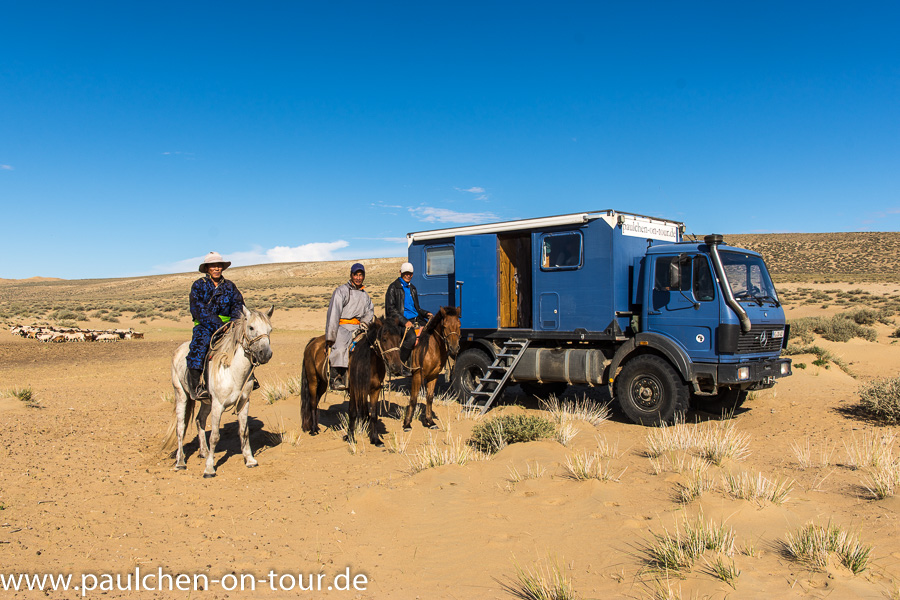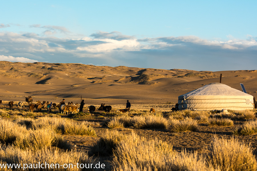 In Zuungobi bogen wir zum Bayan Nuur ab, einem wunderschönen See inmitten von Sanddünen. Wegen der spärlichen Vegetation in diesem Wüstengebiet leben auch einige Nomaden mit ihren Tieren an dem See. Unsere Ankunft blieb nicht unentdeckt und so kamen die Hirten auch mal auf einen „Plausch“ bei ihren neuen Nachbarn vorbei. Kommt man selbst zu Fuß an einer Jurte vorbei wird man immer von den freundlichen Nomaden eingeladen und meist auch bewirtet. Für Achim wurde extra ein Kamel gesattelt und er durfte mal dieses Wüstenschiff navigieren.