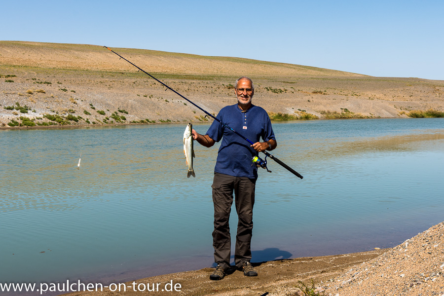 Am nächsten Morgen erreichten wir den Kanal zwischen den Seen. Bayar hatte erzählt, dass es große Fische im See gäbe. Also nutze Achim die Gelegenheit und packte die Angel aus. Es lief gut und schon bald hatte er drei ordentliche Fische aus dem Wasser gezogen. Zubereitung und Verzehr mussten bis abends warten.