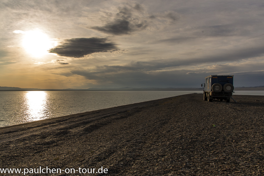 Wir fuhren noch ein Stück am Airag Nuur entlang bevor wir umdrehten und zur Teerstraße am Nordufer des Khyargas Nuur zurückkehrten. Einem Tipp folgend wählten wir die Südspitze der großen Halbinsel als Übernachtungsplatz. Die letzten fünf Kilometer wurde die Landzunge immer schmaler und man kam auf dem Kies nur langsam voran.