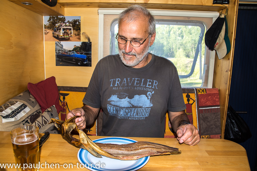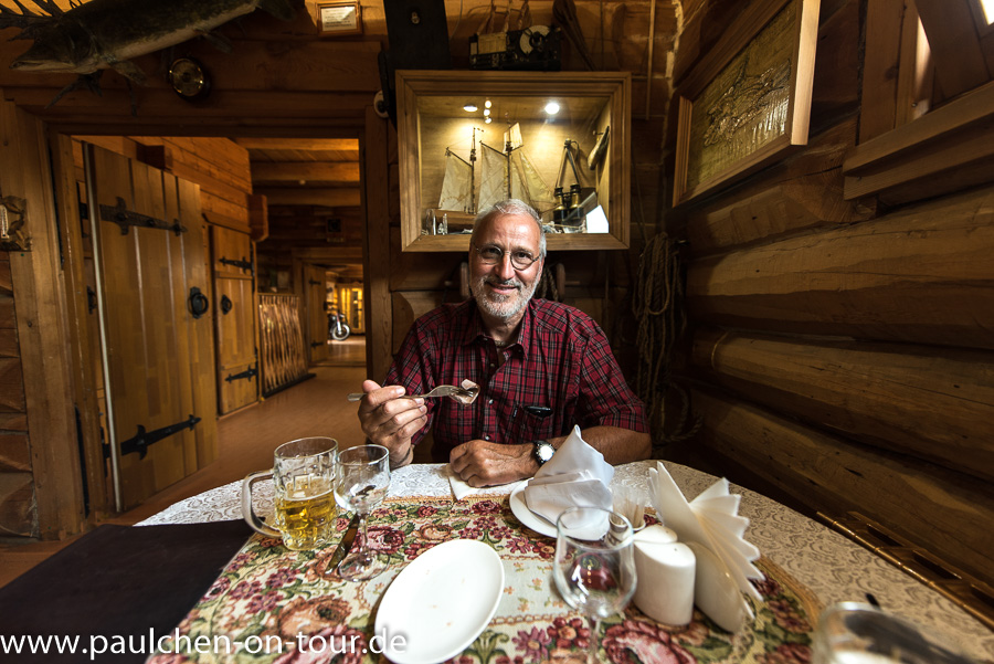 Die Abreise nahte, aber wir wollten nicht fahren ohne Tatianas Tipp zu folgen und das urige Restaurant mit den jakutischen Spezialitäten zu besuchen. Die Speisekarte war nur in Russisch und so gestaltete sich die Auswahl etwas schwierig, dafür mit einem gewissen Überraschungseffekt. Achim kostete eine besondere Spezialität, gefrorene rohe Fohlen-Leber.