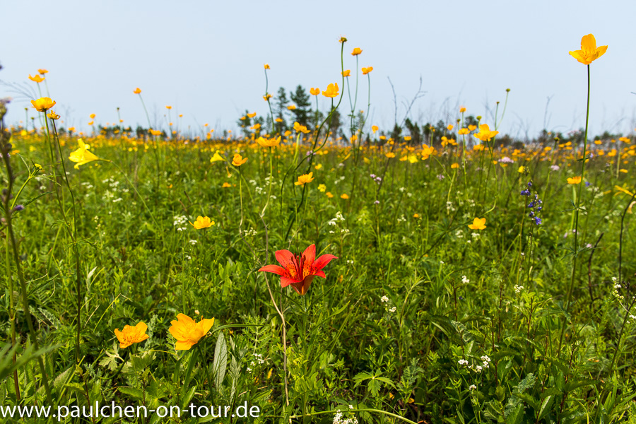 Die nächsten Tage waren Fahrtage, wir durchfuhren wieder Sumpflandschaften, wunderschöne Blumenwiesen und Taiga auf guter Teerstraße bis Never, wo wir nach Norden abbogen. Auf bester, neuer Straße ging es nun Richtung Jakutsk, dachten wir. Aber schon nach 30 Kilometern war dieser Traum zu Ende, Wellblechpiste. Insgesamt waren die folgenden 1150 Kilometer ein Mix aus allem, von bester Teerstraße bis zu schlechter Piste. Auch hier sind überwiegend LKW unterwegs, die die Versorgung der nördlichen Gebiete sicherstellen. Zwar ist eine Eisenbahnstrecke mit Anbindung an die BAM und Transsib nach Norden gebaut, doch fehlt noch die seit Jahren geplante kombinierte Eisenbahn- /Straßenbrücke über die Lena zum Zielbahnhof in Jakutsk.