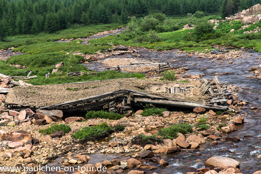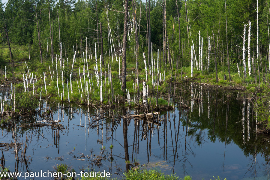 Je weiter man nach Norden kommt umso mehr überwiegen die Nadelwälder und diese werden immer lichter. Entlang der Straße lagen wenige Ortschaften, oft waren sie verlassen und nur noch die Ruinen der Wohnhäuser standen. Aber neue Aktivitäten waren auch zu bemerken, einmal der Straßenbau mit vielen kleinen Camps und Aktivitäten im Zusammenhang mit der Exploration der in Jakutien (Sacha) reichhaltig vorhandenen Bodenschätze. Allein an drei riesigen Camps von Gazprom kamen wir vorbei.