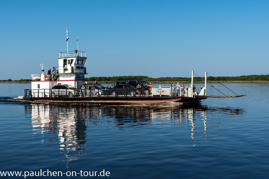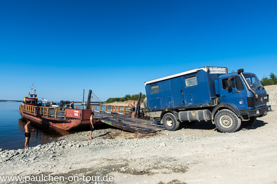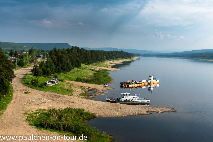 Etwa 100 Kilometer vor Jakutsk hatten wir die erste Möglichkeit an den Fluss Lena zu gelangen, die wir natürlich nutzten. Ein Stück flussabwärts lagen ein paar kleine Fähren, die auf Kundschaft warteten. (Die eigentliche Fährlinie zur Stadt Jakutsk liegt weiter nördlich, ist aber meist sehr stark ausgelastet.) Kurzentschlossen nahmen wir die nächste Fähre über die Lena und fuhren am nächsten Tag zunächst mal flussaufwärts Richtung Sinsk, also weg von Jakutsk, um einen Blick auf die berühmten Lena-Säulen zu werfen.