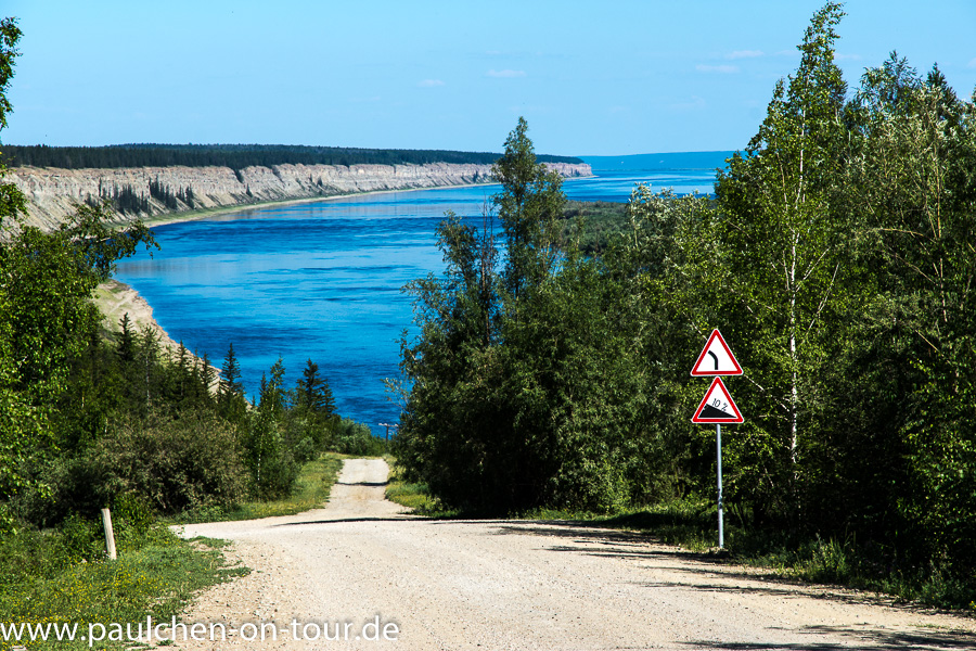 Schon auf der Fähre meinte man, dass man nur bis Tit-Ary fahren könne. Wir wollten es nicht recht glauben, denn in unserer Reise Know-How Karte war doch eine gelbe Straße sogar bis ins 500 Kilometer entfernte Olekminsk eingezeichnet. Die mittelgute Piste führte weite Strecken inländisch durch sumpfige Wälder und Weideland bei den kleinen Dörfern. Wir näherten uns dem Dorf Tit-Ary, am Ufer der Lena gelegen, und mussten feststellen, dass die im Sommer befahrbare Straße hier abrupt endete. Von dort geht es dann nur noch mit dem Boot weiter, im Winter dagegen gibt es auf der zugefrorenen Lena sogenannte Winterstraßen, die weiter flussaufwärts führen. Wir kehrten also unverrichteter Dinge um, freuten uns dennoch diesen schönen Ausflug unternommen zu haben.