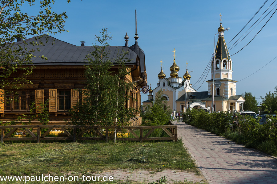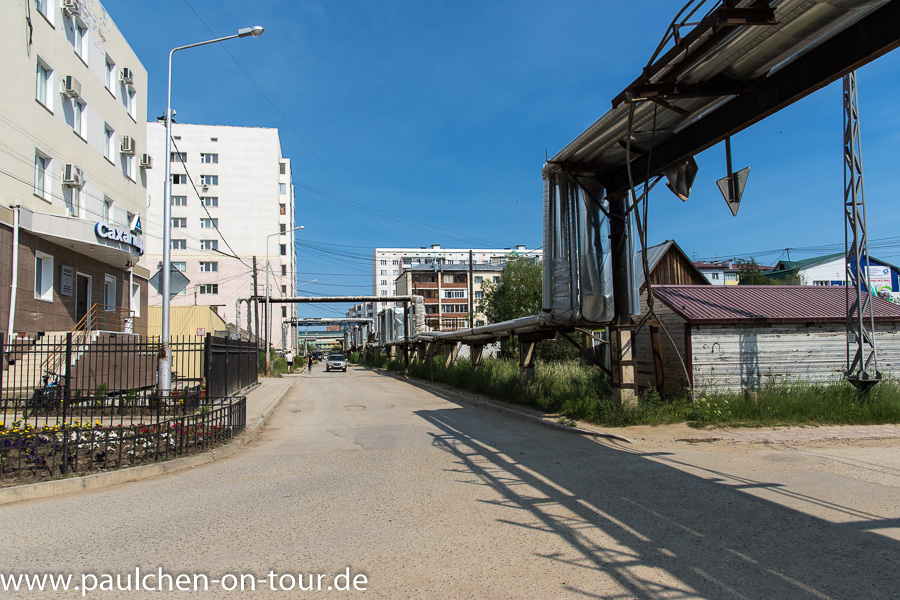 Die Republik Sacha (Jakutien) ist reich an Bodenschätzen (Diamanten, Gold, Kohle, Gas) und liegt auf Permafrostboden. Selbst im Sommer ist der Boden nach ein bis zwei Metern gefroren. Aus diesem Grund sind alle Häuser auf Betonstelzen gebaut, die ca. 8m in den frostigen Boden gerammt werden, und sämtliche Versorgungsleitungen sind oberirdisch verlegt. Ein ungewohntes Stadtbild für uns.
