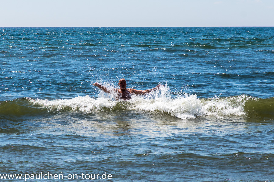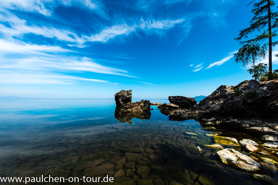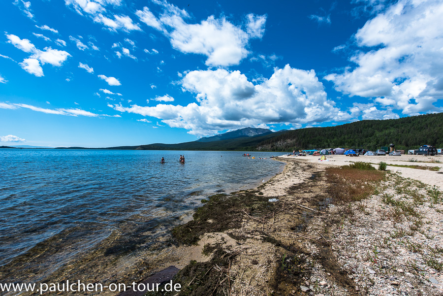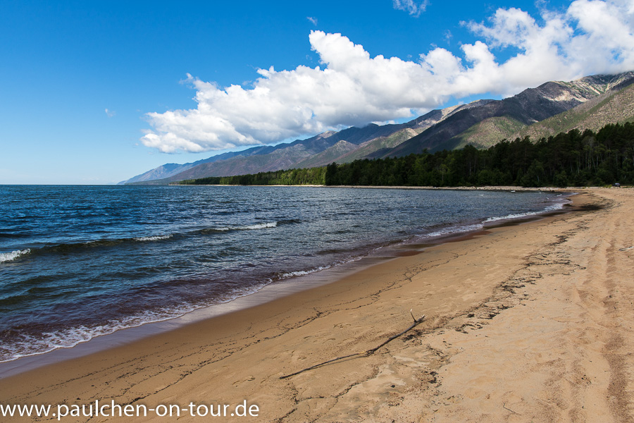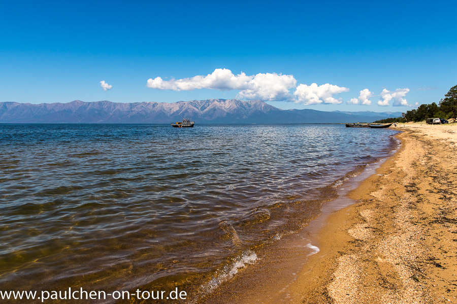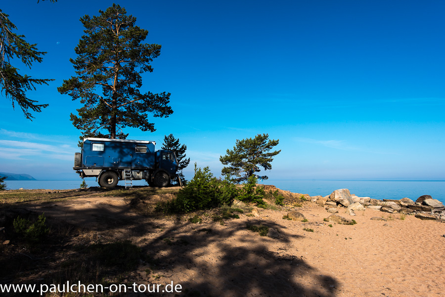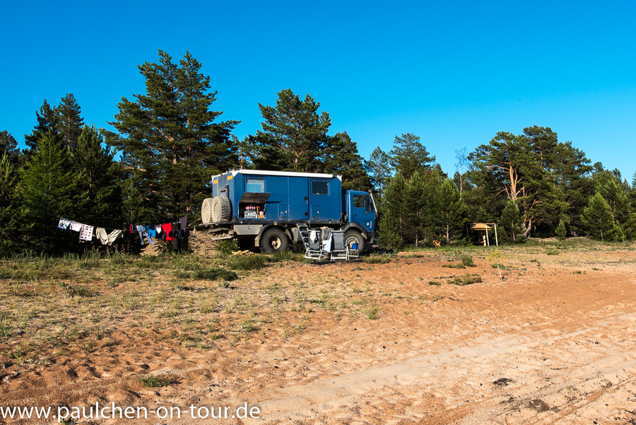 Knapp 200 km nördlich von Ulan Ude erreichten wir die Ostseite des Baikalsees. Gleich auf dem ersten Stück des frei zugänglichen Küstenstreifens entdeckten wir einen schönen Stellplatz. Auch viele Einheimische hatten schon das Wochenende eingeläutet und waren zum See gekommen. Vor allem begeisterte uns wieder das absolut klare und transparente Wasser.