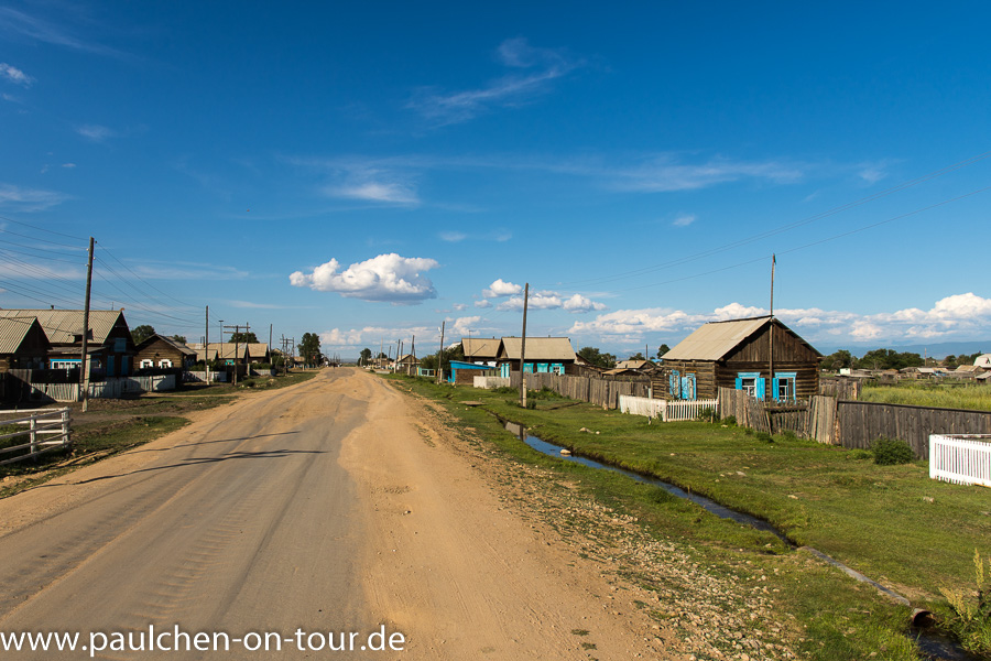Die recht gut ausgebaute Piste, für die vielen Holzlaster, führt durch kleine Dörfer mit den typischen sibirischen Holzhäusern. Da das Gebiet noch zu Burjatien gehört, kommt man auch immer wieder an buddhistischen Tempeln vorbei.