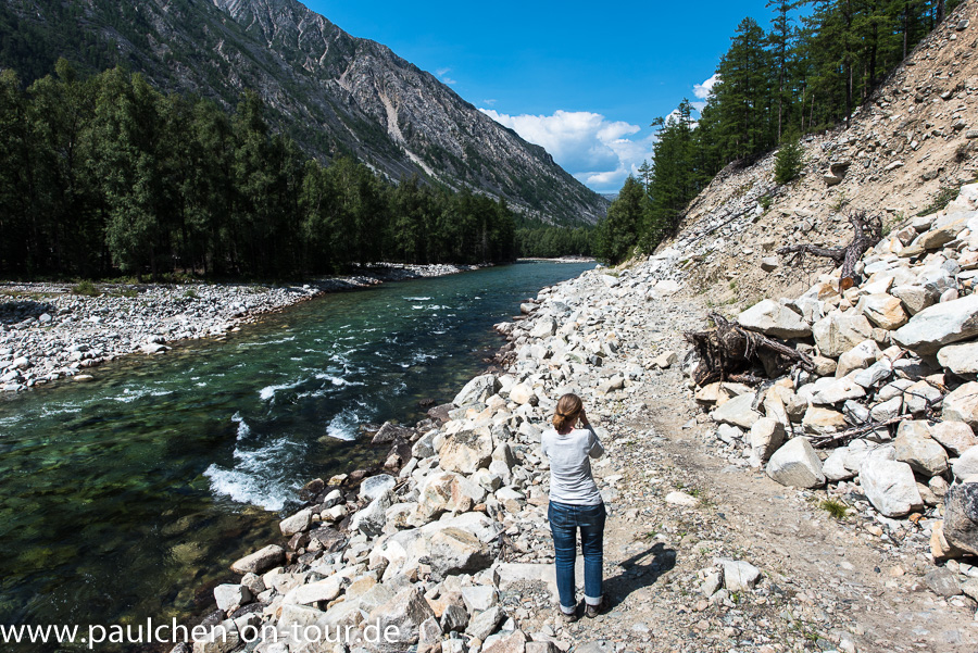 In weiten Strecken führte die Piste nun parallel zu schönen, klaren Flüssen. An verschiedenen Stellen waren die Hänge abgerutscht und hatten den ursprünglichen Weg verschüttet. Da außerhalb des Naturreservats die Piste nicht mehr gepflegt wird, muss sich jeder seinen eigenen Weg hindurch suchen. Das waren mal kleinere Steine oder auch größere Wacker, die es zu überwinden galt. Hierbei sind wir mit unseren großen Rädern im Vorteil und müssen nicht um jeden Stein herum rangieren.