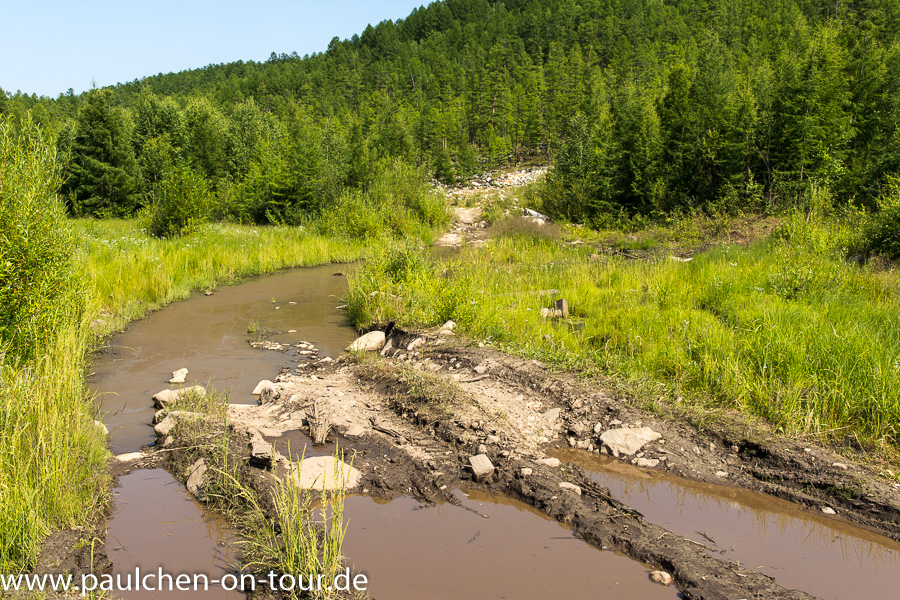 Hin und wieder mussten kleine Wasserläufe durchfahren werden, aber wir kamen gut voran. Dann wurde die Piste stellenweise matschig und wies tiefe Spurrillen auf. Zum Glück waren es LKW Spuren, in denen wir relativ gut fahren konnten.