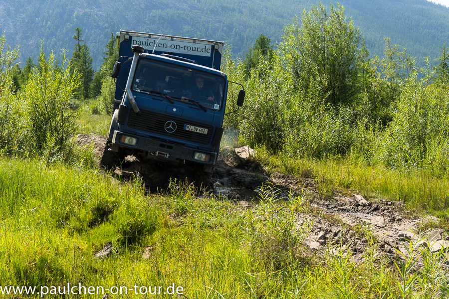 Die nächste Herausforderung ließ nicht lange auf sich warten, ein sumpfiges Wiesenstück musste durchfahren werden. Wir sahen schon im Vorfeld das dies schwierig werden würde, denn der Weg war schon sehr aufgewühlt und man erkannte Spuren von Bergungen anderer Fahrzeuge. Also mit Schwung hinein und fast hindurch, denn am Ende erwischte es uns doch noch. Nun war buddeln angesagt. Ein echtes Vergnügen im feuchten Sumpf umschwirrt von vielerlei Blutsaugern. Da das Schaufeln nicht so recht zum Erfolg führte, suchten wir die Umgebung nach einem geeigneten Baum für unsere Seilwinde ab. Ausgerechnet hier gab es nur dünne Exemplare und so einen zogen wir dann samt Wurzel aus der Erde. Für den zweiten Versuch fanden wir glücklicherweise im Dickicht noch eine verrottende Holzbrücke, an der wir das Seil befestigten und uns aus dem Schlamassel herauszogen.